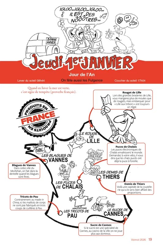 140年も続く伝統とフレンチ・ユーモアの小さな博物館、アルマナ・ヴェルモ2026年入荷しました。諷刺画、面白い話、表現や慣用句、クイズ、ディクテ、レシピ、占い、一般教養、歴史など多様なテーマが、一日一ページ掲載されている歳時記です。2026年ならではの新コーナーでは、地方の奇妙な伝説、有名な落ちこぼれ、世界の都市のあだ名、フランス史未解決事件、映画史上最長のキスシーン、時代の海賊など面白い記事が豊富に揃っています。140年変わらない赤い表紙をめくると、マクロン大統領の写真、次いで国会議員のプロフィール一覧などアクチュアリティな情報が多くて、役に立ちます。鋭い視点で社会の最新ニュースを描くイラストとともに、軽妙なユーモアあふれる2026年を過ごしましょう。