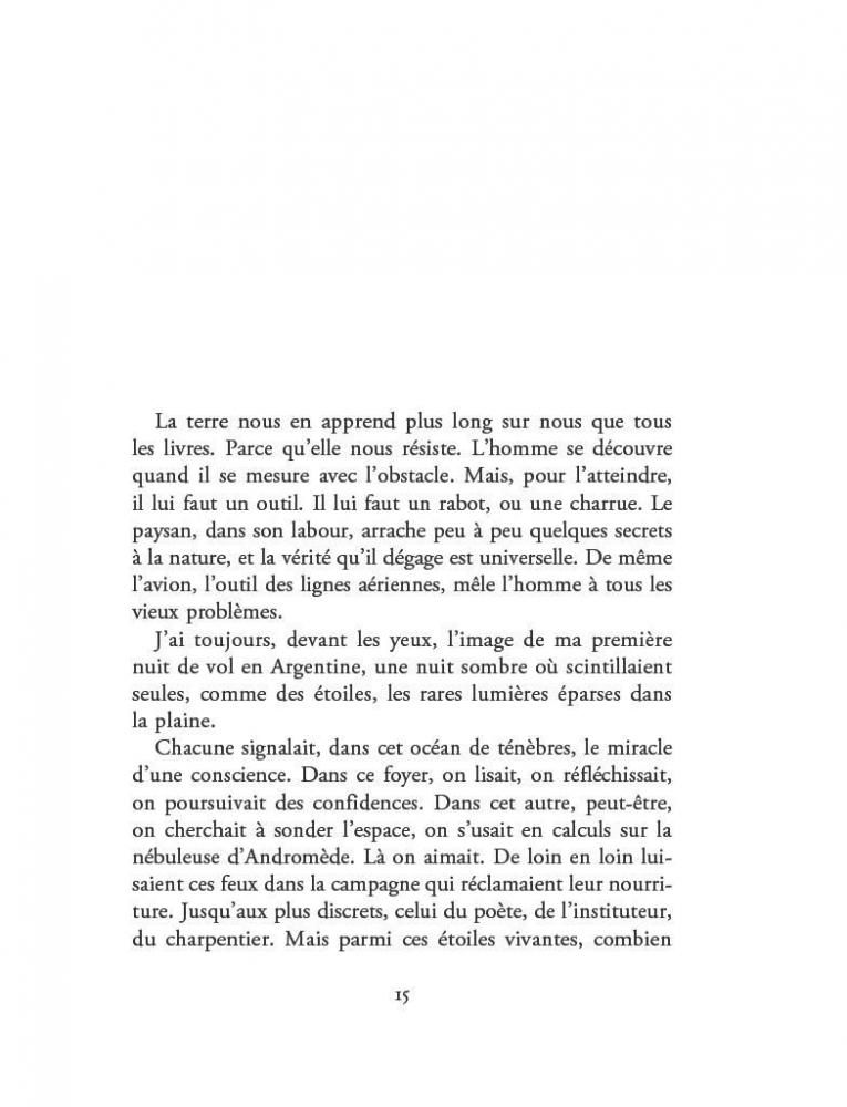 『星の王子さま』のサン=テグジュペリによる、飛行機を操縦しながら遭遇したさまざまな困難や直面した生死などをテーマに、人間の尊厳や自然との関係についての考察です。